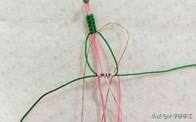 12、如圖金線在綠色線繞一圈,這是雀頭結(jié)的步,從上往下繞的