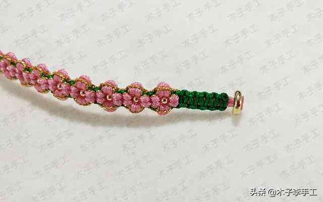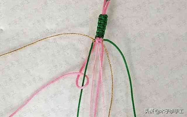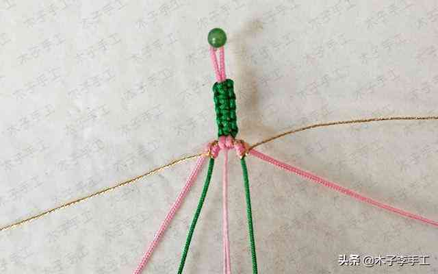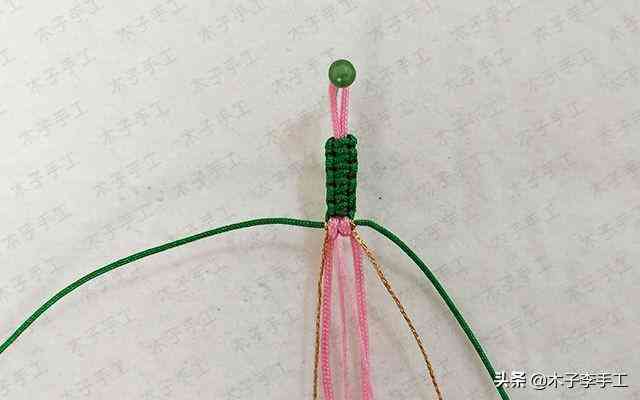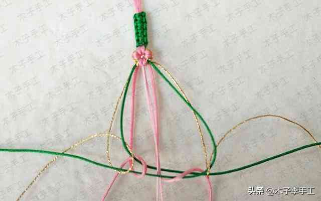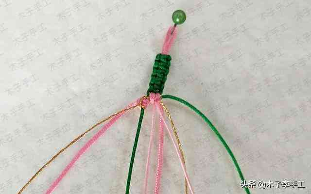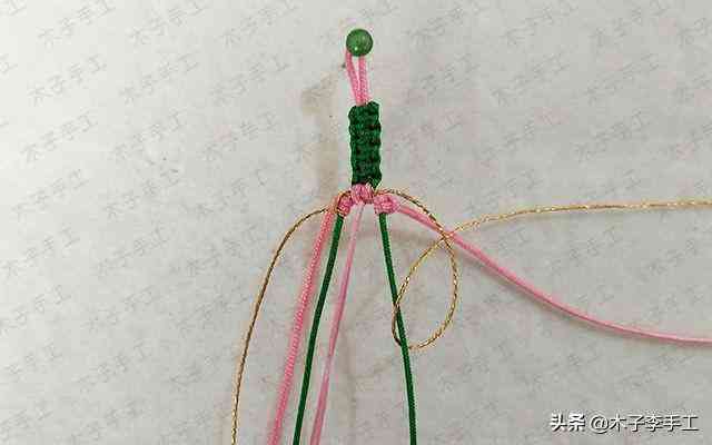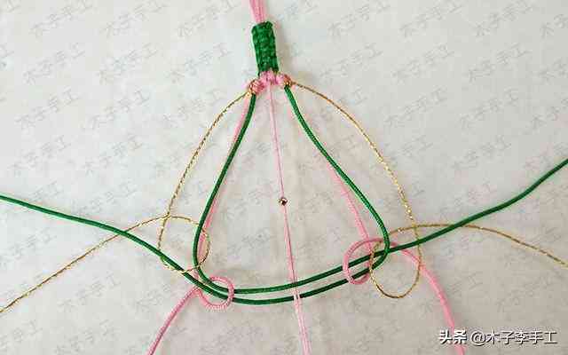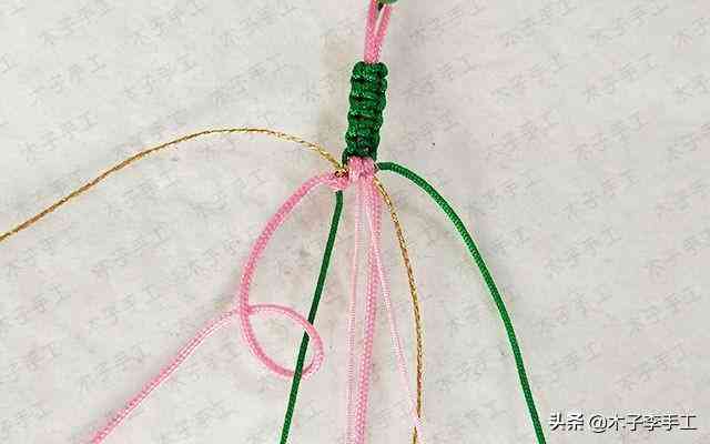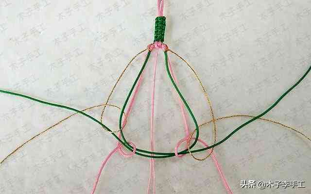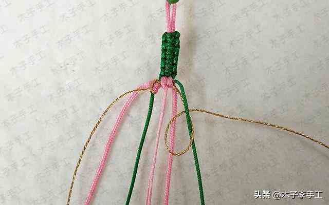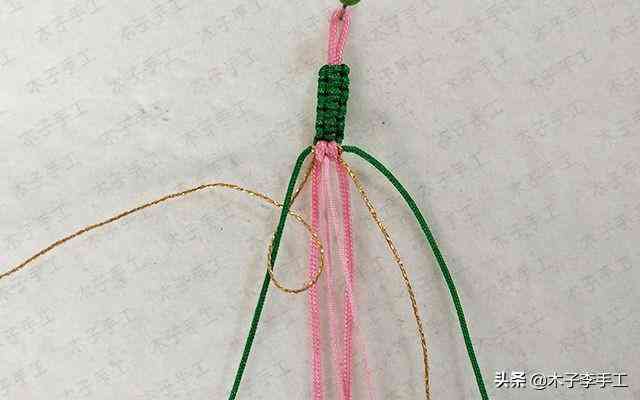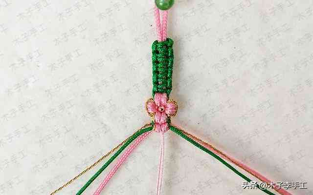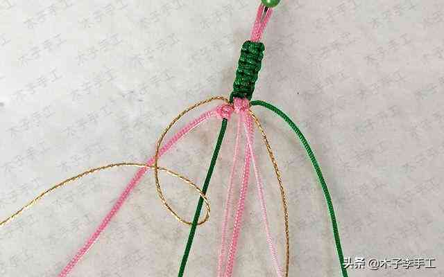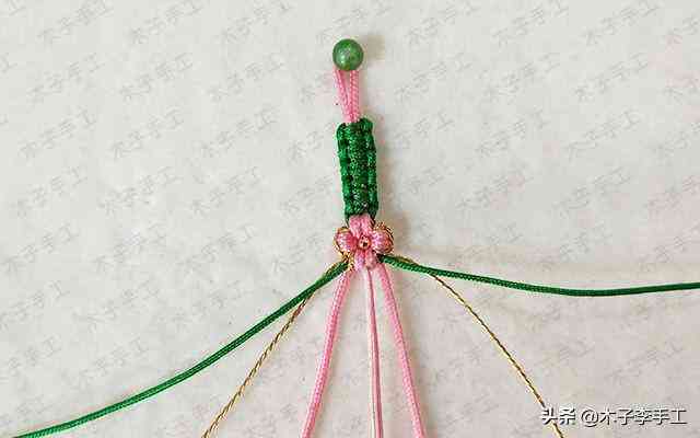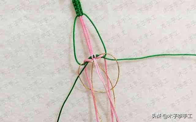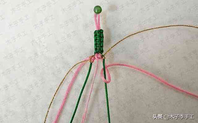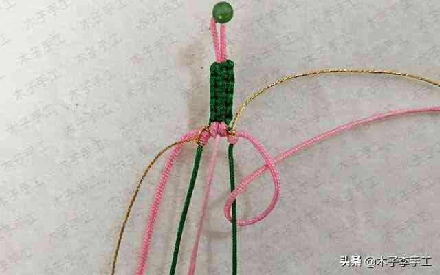 22、根前面一樣,綠色線再次交叉,金線和粉紅色A玉線分別在左右兩邊繞一圈