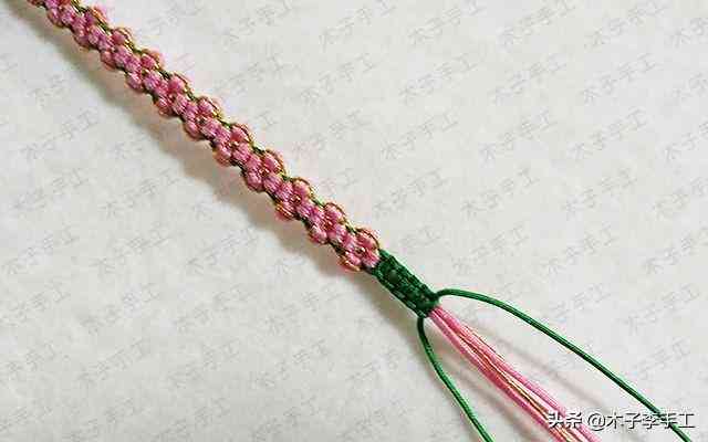 16、拉緊金線,金線的雀頭結(jié)就在粉紅色線的雀頭結(jié)上面