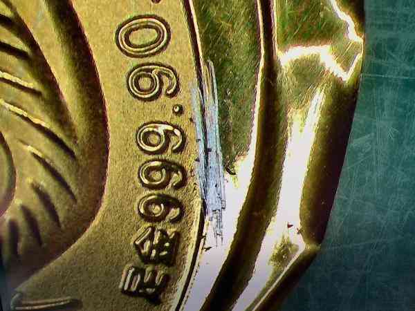 不過(guò)很快,肖先生發(fā)現(xiàn)事情不對(duì)勁了。2023年1月2日,他仔細(xì)端詳發(fā)現(xiàn),“金幣”邊緣截面竟是白色的,此外輕輕刮去“金幣”表面金色,用放大鏡看,里面竟是灰色的。