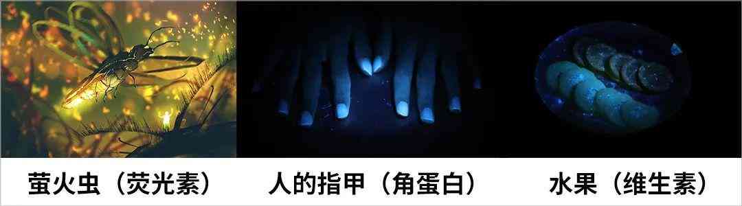 最常見的,螢火蟲(熒光素)、人的指甲(角蛋白)、水果(維生素)……