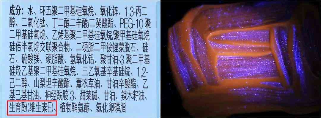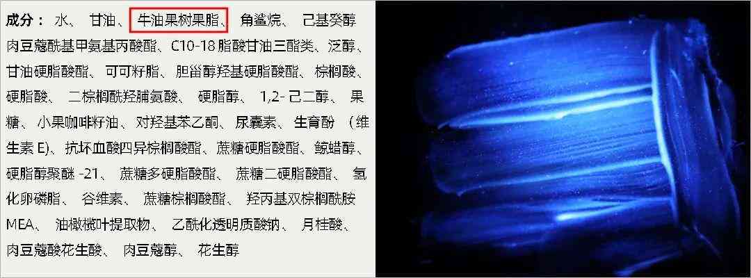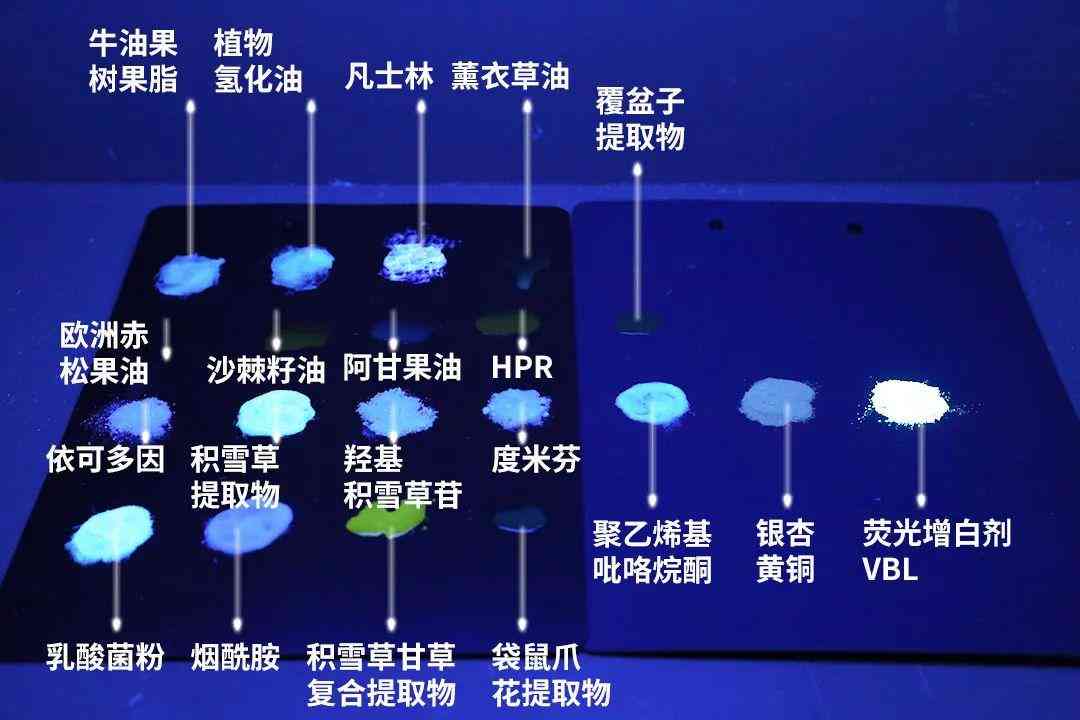 其中,牛油果樹果脂、植物氫化油、凡士林、依可多因、積雪草提取物、羥基積雪草苷、度米芬、乳酸菌粉、煙酰胺等這些物質(zhì),產(chǎn)生的藍(lán)紫色熒光現(xiàn)象與熒光增白劑非常相似。