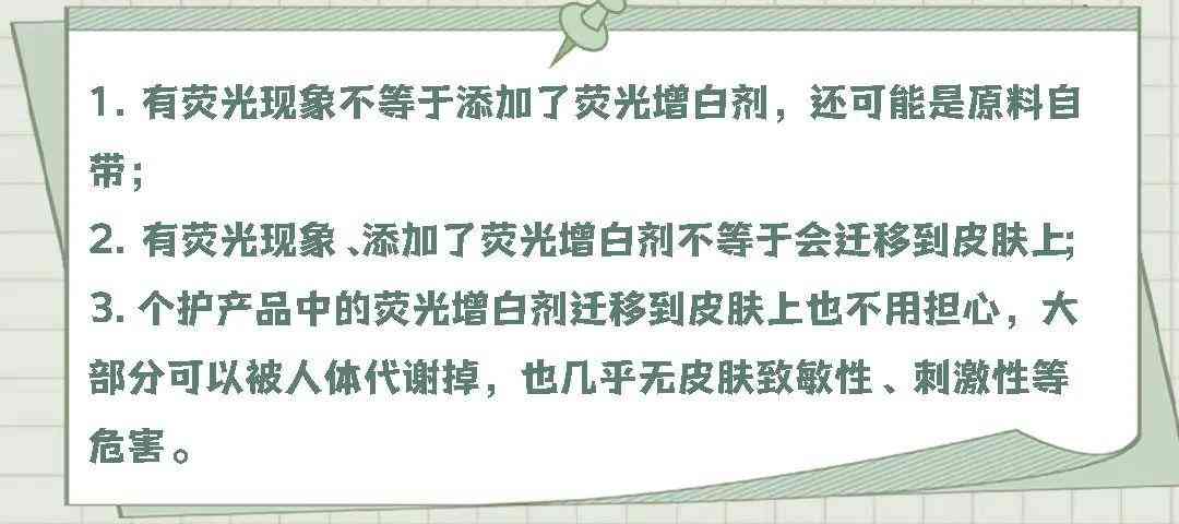 總得來說,即使是產(chǎn)品有熒光反應(yīng),但不一定會遷移到皮膚上;熒光遷移也并不可怕,它會隨著清洗、代謝而消失。