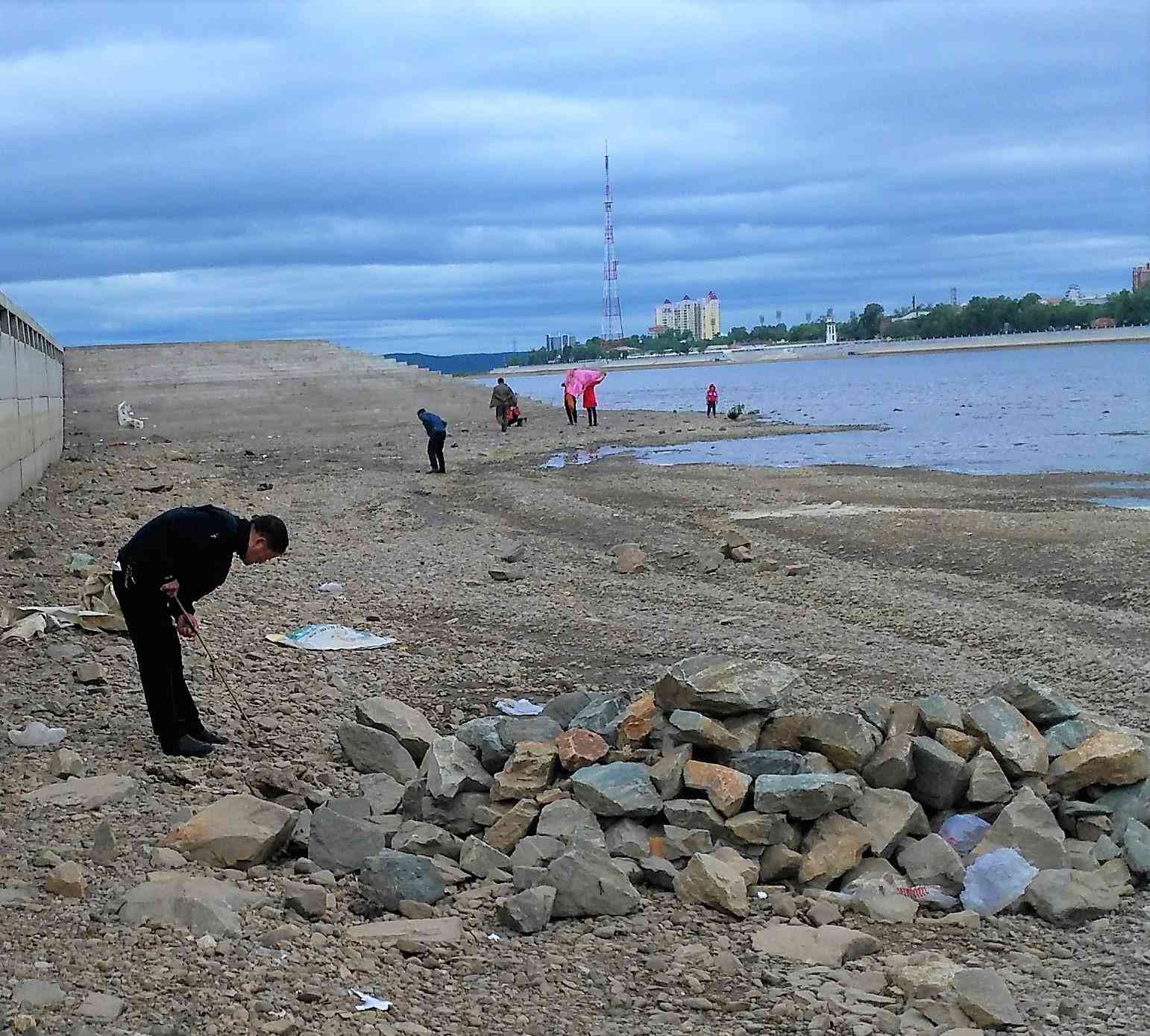 不過在黑河江邊,你還會有另外一個發(fā)現(xiàn),那就是江邊會有很多低頭尋寶撿石頭的人,有當?shù)厝艘灿型獾赜慰停踔聊矫鴣韺3虛焓^的人。