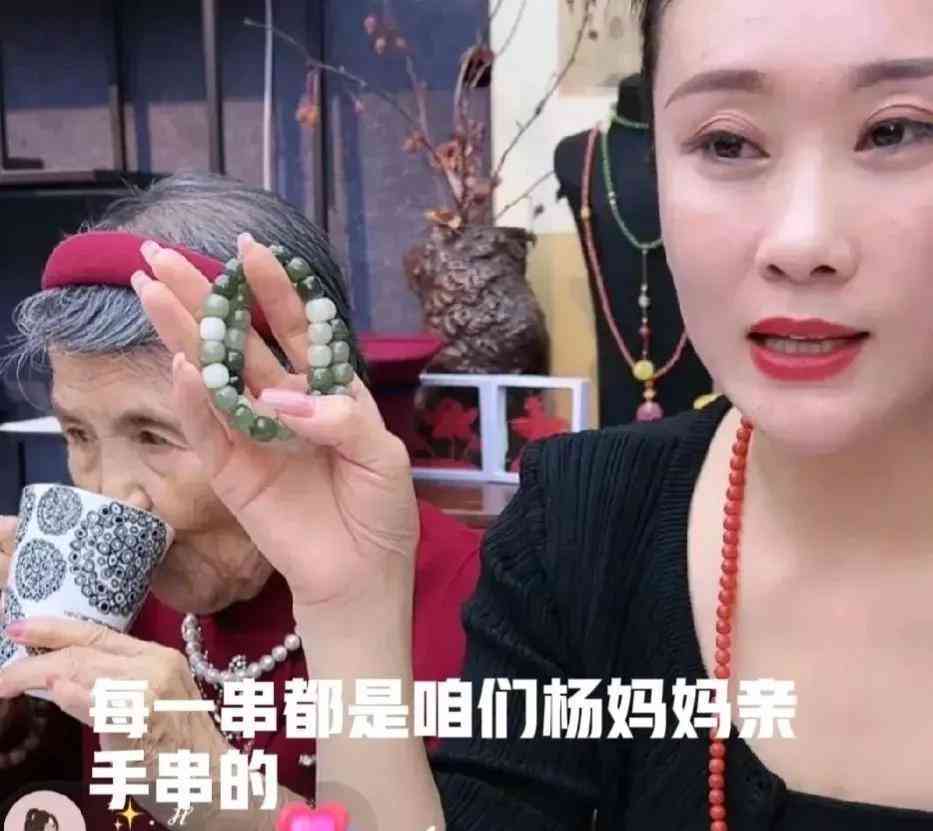 一位女主播向網(wǎng)友介紹珠寶,她拿著一條和田玉手串,對著網(wǎng)友說:“這是楊奶奶親手串的,只要199元一串,大家放心的拍!”