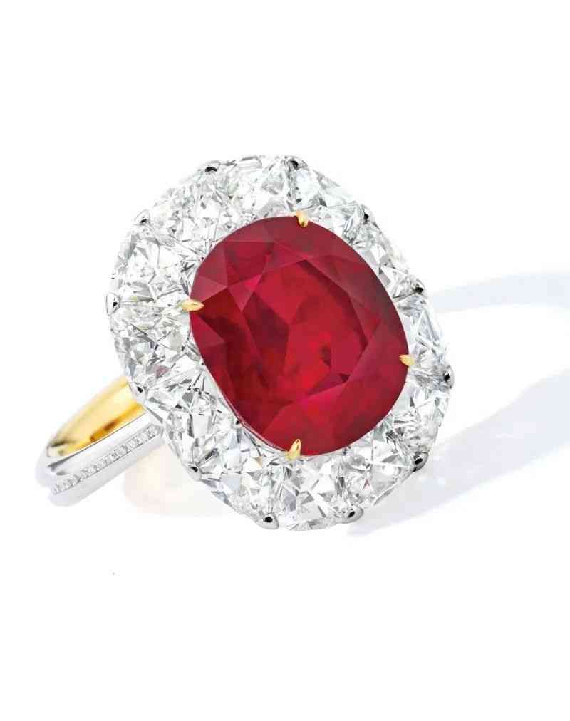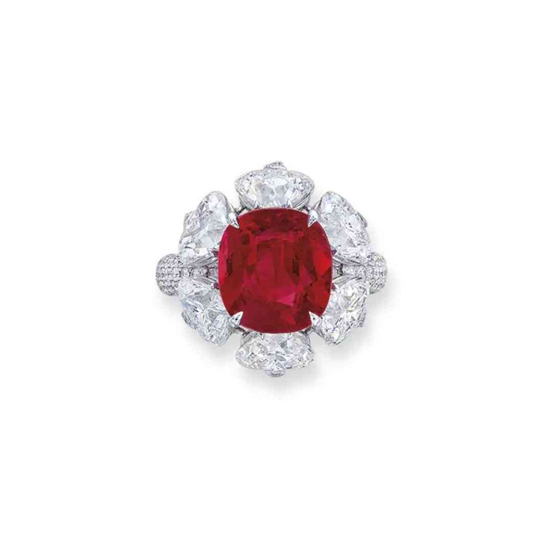 上圖這款枕形紅寶石戒指,主石為5.05克拉的緬甸無燒紅寶石,顏色同樣也是鴿血紅色,在2020年佳士得拍賣會上,以15850000港元成交。