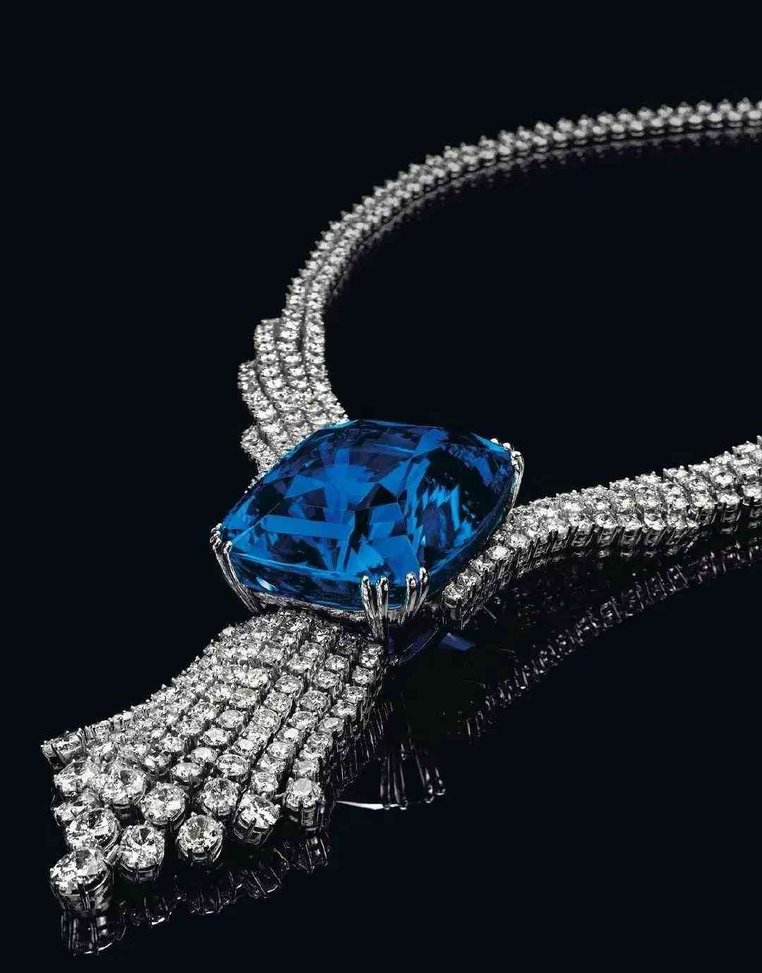 上圖這條亞洲藍(lán)美人項(xiàng)鏈,主石為392.52克拉的孔雀藍(lán)藍(lán)寶石。