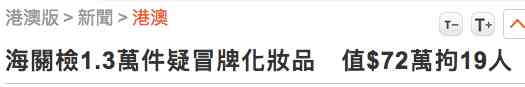 2017年12月,香港海關(guān)在油麻地、旺角、佐敦10間藥坊及藥房搜獲5200件冒牌化妝品及護膚品,價值67萬港元,不排除部分已流入市面。