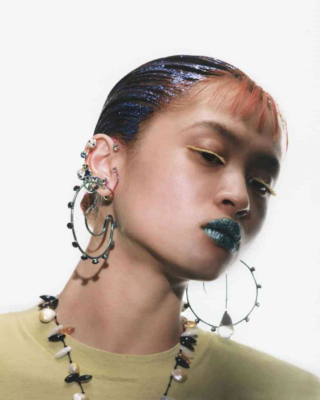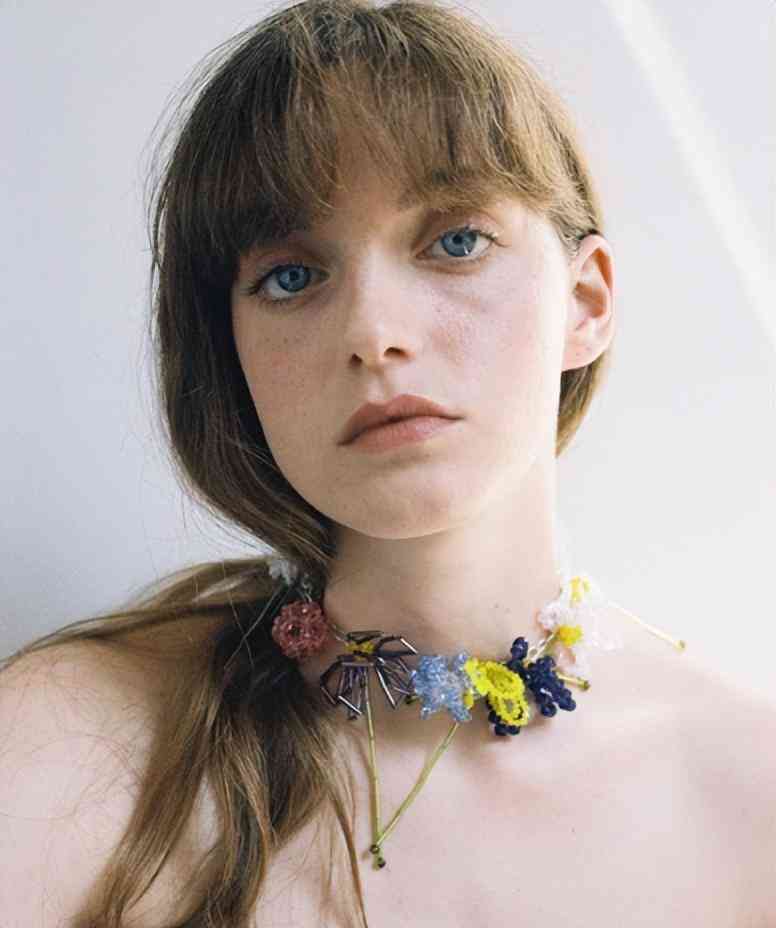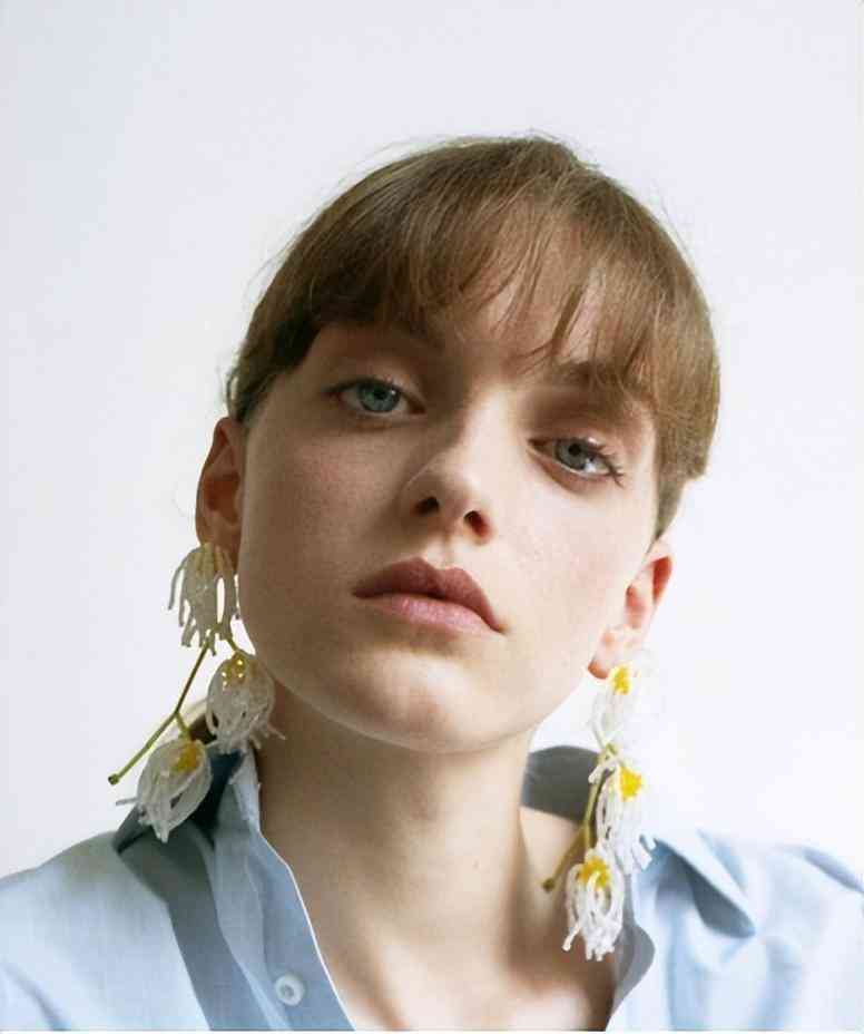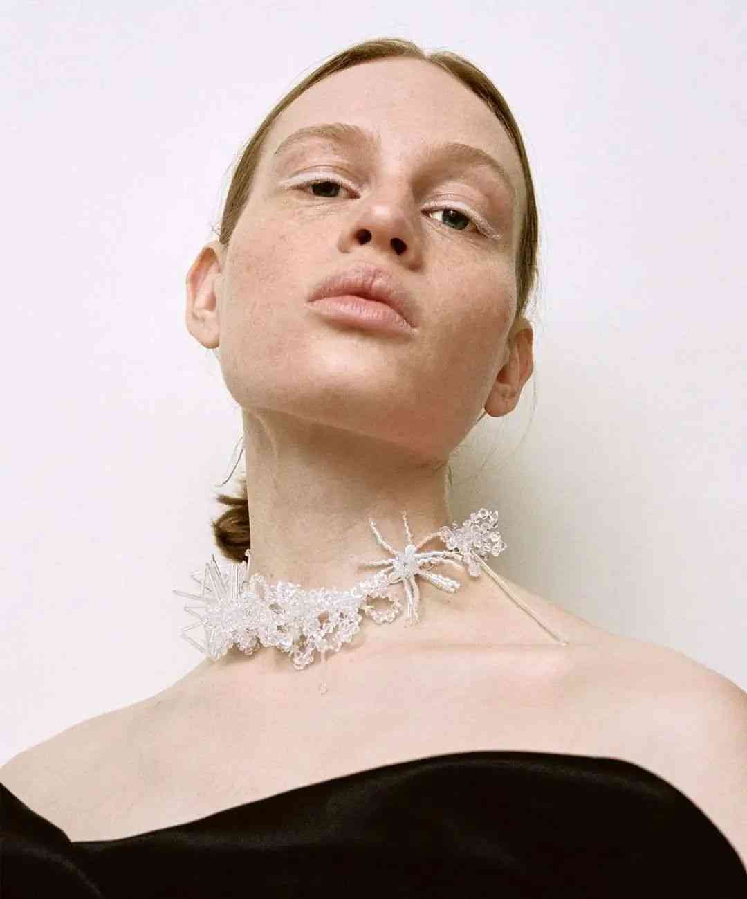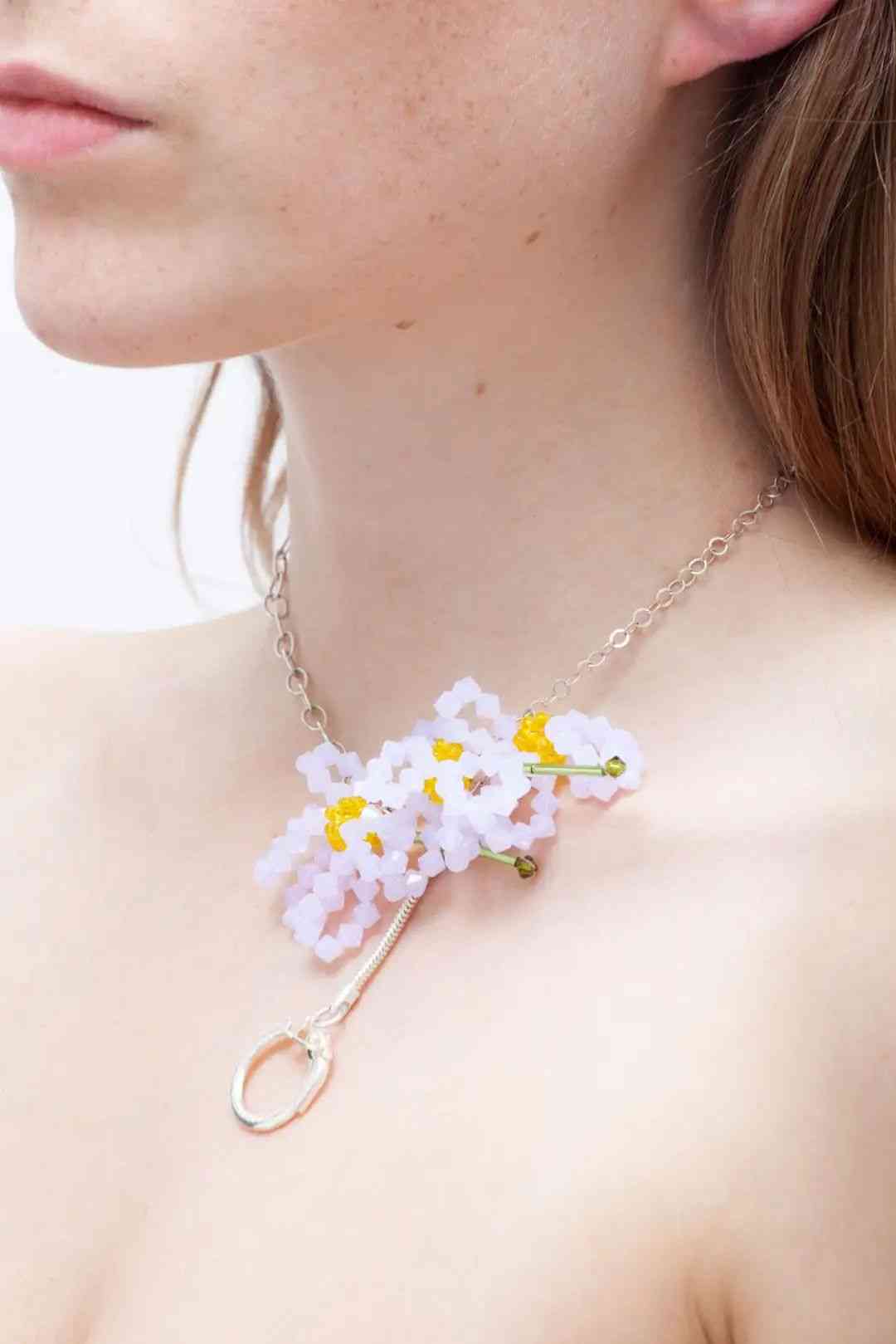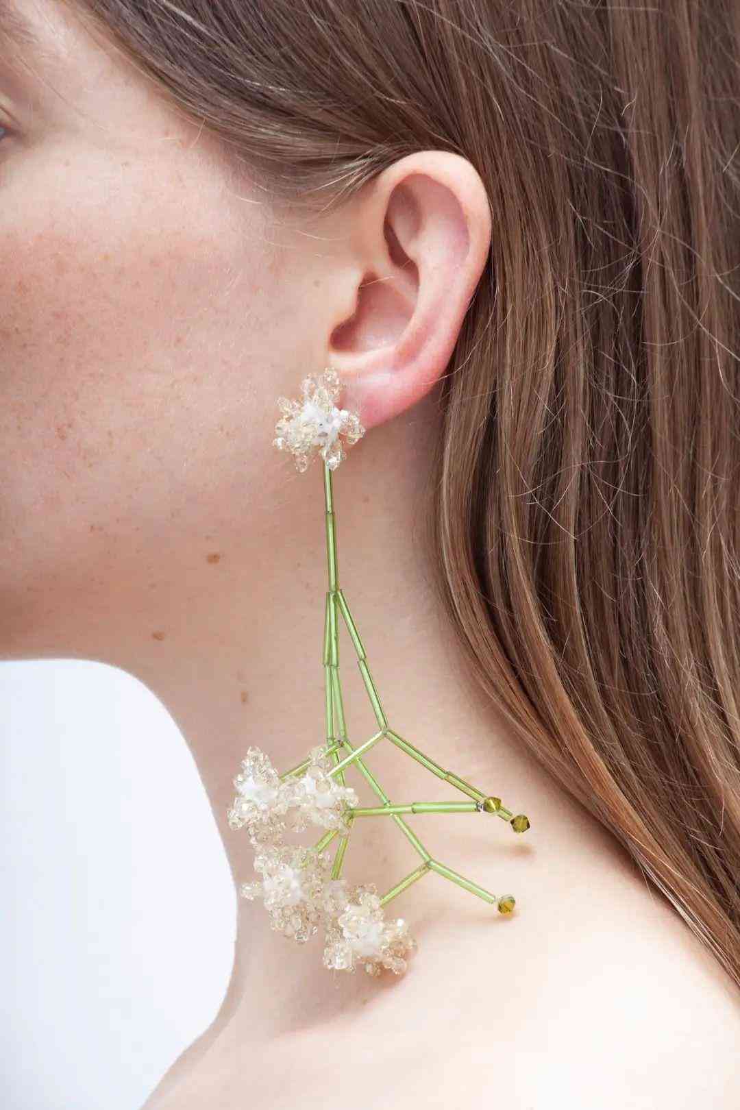 以高質(zhì)量水晶和玻璃珠用串珠的技法連接在一起,串珠耳環(huán)掛在耳垂上讓水晶的枝葉沿著脖子慢慢滑落。Helena認(rèn)為, “我想將做法簡單的東西變成更具有價(jià)值和貴族氣息的事物?!?/span>