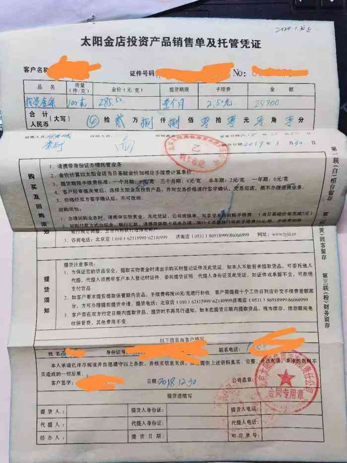 李飛介紹,2018年12月,李飛在購買金條時,填寫《太陽金店投資產(chǎn)品銷售單及托管憑證》。該文件顯示,李飛購買了100克金條,每克金價285.5元,每克手續(xù)費2.5元,投資本金總計2.88萬元,預約一個月后提貨。