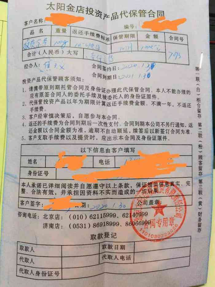 一個月后,李飛并未提貨,而是攜帶原到期托管合同及身份證,辦理《太陽金店投資產(chǎn)品代保管合同》,根據(jù)合同,太陽金店幫李飛保管100克金條,一年到期后,李飛可以獲得1000元手續(xù)費。后來,李飛一共續(xù)簽了兩次,最后一次簽約是在2020年1月30日。