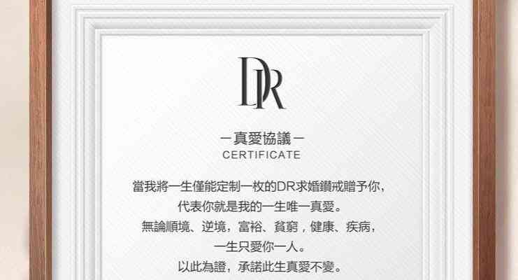 DR之所以能在萬千鉆石品牌中脫穎而出,都要?dú)w功于DR的理念,即“男士一生只能定制一枚”。DR有自己的認(rèn)證系統(tǒng),每一個(gè)需要定制求婚戒的男士必須實(shí)名登記個(gè)人信息和女方信息,一旦登記就無法更改,沒錯(cuò),你這輩子只能送這一個(gè)人啦!