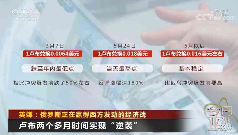 據(jù)CCTV4 6月8日?qǐng)?bào)道,面對(duì)西方的經(jīng)濟(jì)圍剿,俄羅斯盧布觸底反彈實(shí)現(xiàn)逆襲。英國(guó)媒體指出,俄羅斯正在贏得這場(chǎng)由西方發(fā)動(dòng)的經(jīng)濟(jì)戰(zhàn)。