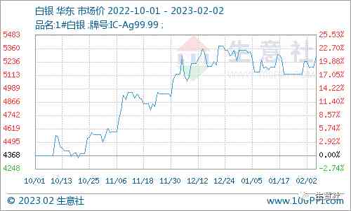 據(jù)生意社監(jiān)測,2023年2月2日白銀市場均價(jià)5293.67元/千克,日漲2.13%。較1月1日現(xiàn)貨市場早盤均價(jià)5345元/千克,下跌0.96%;較2022年10月1日現(xiàn)貨市場早盤均價(jià)4368.33元/千克,上漲21.18%。