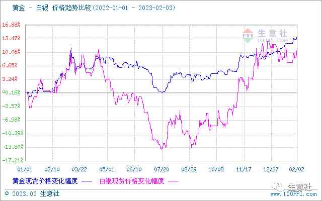 2022年貴金屬黃金白銀漲跌趨勢趨同,但是在4-8月份白銀跌幅較深,之后回暖,12月份白銀延續(xù)強(qiáng)勢行情,黃金高位盤整。進(jìn)入2023年貴金屬黃金價(jià)格向好,白銀高位盤整。