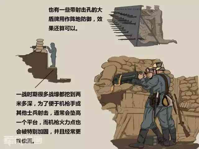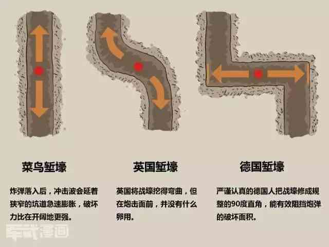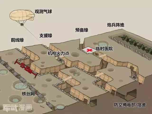 塹壕防守使得戰(zhàn)爭(zhēng)曠日持久,誰也打不贏誰,但在機(jī)槍稱霸戰(zhàn)場(chǎng)的時(shí)代,這也是無奈的選擇。不過,戰(zhàn)爭(zhēng)初期交戰(zhàn)雙方都沒料到會(huì)打成持久戰(zhàn),也沒有挖塹壕的準(zhǔn)備,英國(guó)士兵裝備里根本沒有挖掘工具(德軍開始也沒有),無奈只能去附近村莊搜刮鏟子。那么,怎樣挖一條像樣的戰(zhàn)壕呢?首先,不能挖成一條直線,狹長(zhǎng)的坑道會(huì)讓炮彈更具破壞力。如果敵人的沖鋒槍兵跳入戰(zhàn)壕,或是坦克在上面碾過時(shí),子彈可以暢通的掃射整條壕溝。于是英國(guó)將戰(zhàn)壕修成曲線,并挖的越來越深,但是面對(duì)炮擊時(shí),仍然不能有效的阻擋沖擊波在壕溝內(nèi)肆無忌憚的收人頭。而德國(guó)人將塹壕挖成標(biāo)準(zhǔn)的90直角,可以有效的遏制炮彈沖擊波的蔓延。而隨著戰(zhàn)爭(zhēng)越拖越久,塹壕也挖得越來越深,并被日益加固和完善,形成了一道道錯(cuò)綜復(fù)雜的塹壕迷宮。