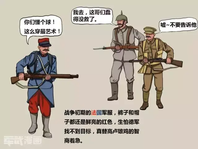 說到士兵們的穿著,一戰(zhàn)的軍服已經(jīng)明顯的從“排隊(duì)槍斃”時(shí)代的“華麗型”進(jìn)化為簡(jiǎn)單可靠的“實(shí)用型”了。但是戰(zhàn)爭(zhēng)初期在各國(guó)都采用隱匿色設(shè)計(jì)軍服的時(shí)候,法國(guó)還是耿直的穿戴著藍(lán)色的衣服及高純度的紅色褲子和帽子,要知道紅色和橘色這些暖色調(diào)即便是在迷霧天氣也是比其他顏色顯眼的,想讓人看不見都難,現(xiàn)在的汽車尾燈之所以是紅色也是這個(gè)原因。古代時(shí)軍服設(shè)計(jì)得顏色鮮亮華麗是為了區(qū)分?jǐn)澄?、方便指揮、增添氣勢(shì)??傻搅爽F(xiàn)代戰(zhàn)場(chǎng)上,鮮艷的衣服只能是提醒敵人“向我開火!”直到1916年,法國(guó)才終于拋棄了以前的舊軍服,換裝了為塹壕戰(zhàn)量身訂做的灰色軍服,并且配備了頭盔(估計(jì)是之前被爆頭太多次長(zhǎng)記性了)。但是軍官仍然是鮮艷華麗的服裝,腐敗呀!