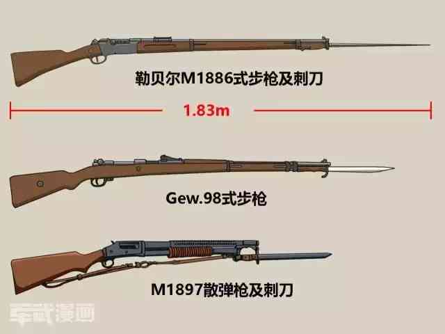 塹壕中作戰(zhàn)時(shí)大部分情況都是近身肉搏,由于步槍的殺傷效率會(huì)被射速和裝彈速度所限制,在沖鋒槍和手槍沒有被大量裝備的情況下,冷兵器再次被各國(guó)重視起來,首當(dāng)其中的當(dāng)屬步槍上的刺刀。當(dāng)然,初期大家都認(rèn)為誰的刺刀長(zhǎng)誰在近戰(zhàn)中就越占便宜,你槍上的刺刀要是少于50厘米,你都不好意思跟敵人打招呼。所以各國(guó)早期都是長(zhǎng)槍配長(zhǎng)刺刀,短槍更要配長(zhǎng)刺刀,狙擊槍也得配長(zhǎng)刺刀……其中法國(guó)勒貝爾M1886步槍,裝備的M1886三棱刺刀長(zhǎng)達(dá)52厘米,裝在槍上后整支步槍長(zhǎng)度達(dá)到了1.83米,想端著這么長(zhǎng)的槍在塹壕里轉(zhuǎn)個(gè)圈都難,真不知道這群人怎么想的。較長(zhǎng)的刺刀不但行動(dòng)不便,而且容易折斷,刺入敵人身體后也不方便拔出,意識(shí)到這一點(diǎn)后各國(guó)也都大量裝備更短更靈活的刺刀了。