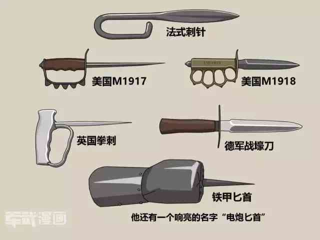 塹壕戰(zhàn)中除了各式刺刀,短小鋒利的戰(zhàn)壕刀或刺針也是士兵喜愛的近戰(zhàn)利器。比如最簡(jiǎn)易的法式刺針,它只需要將一小截固定鐵絲網(wǎng)的鐵桿一段彎折成把手,另一端砸平打磨即可,十分方便量產(chǎn)。美軍在法國(guó)刺針的外形基礎(chǔ)上發(fā)明了M1917戰(zhàn)壕刀(三棱刺刀),后又生產(chǎn)更精致的M1918戰(zhàn)壕刀,指虎形的刀柄不但可以擊打敵人,也使得握刀拼刺時(shí)不容易滑脫。而雖然沒有正式裝備戰(zhàn)壕刀,但是很多士兵都會(huì)購(gòu)買拳刺。相比之下德軍的戰(zhàn)壕刀則顯得中規(guī)中矩。而所有塹壕刀具中最酷炫的當(dāng)屬“鐵甲匕首”了,這種用鐵皮將整個(gè)手和半截小臂包裹,前端裝有刺針的玩意兒還有一個(gè)響亮的名字-“電炮匕首”。感覺像是某款游戲中的人民幣刀具~敢跟我玩近戰(zhàn)?先吃我一記雷光拳!