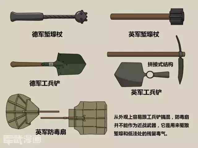 塹壕戰(zhàn)中另一種近戰(zhàn)武器當(dāng)屬壕(bang)杖(chui)了,塹壕杖的款式不計(jì)其數(shù),因?yàn)榇蠖嗍鞘勘鴤冏约篋IY的。當(dāng)然也有一些是制式配發(fā)的,比如德軍流星錘形的塹壕杖,其外觀酷似一個(gè)按摩捶。還有英軍齒輪型的壕杖,被英軍戲稱為“乳牛疙瘩”。當(dāng)然,打起仗來管他什么制式不制式,板磚菜刀什么不可以當(dāng)武器?比如德軍配發(fā)的工兵鏟,鏟柄長(zhǎng)度適中,鏟頭棱角分明,可劈、可次、可扇巴掌。而英軍配發(fā)的工兵鏟是拼接結(jié)構(gòu),可以直接裝上鏟頭揮砍,也可以在鏟柄上加裝各種重物鐵釘,當(dāng)做壕杖使用。