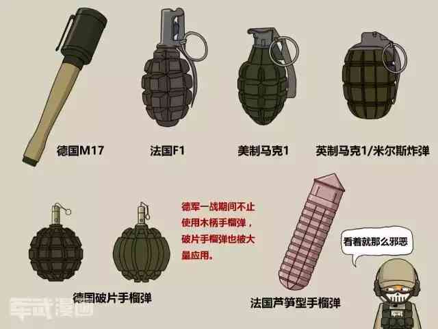 很多人認(rèn)為,木柄的手榴彈是進(jìn)攻型手榴彈,卵狀的是防御型手榴彈,這樣區(qū)分是一個(gè)誤區(qū)(防御手榴彈也有帶木柄的),實(shí)際上正確的區(qū)分方法應(yīng)該是按照它們的殺傷原理。防御型手榴彈裝藥較少,但由于依靠爆炸后的破片和鋼珠殺傷敵人,一般殺傷半徑都在30米以上,士兵在投擲后需要及時(shí)躲避到掩體后。而進(jìn)攻型手榴彈或者叫“震蕩型手榴彈”,裝藥較多,彈壁較薄,由于是依靠沖擊波殺傷敵人,爆炸后的沖擊波在曲折的工事內(nèi)有良好效果,但又不至于因?yàn)檩^大的殺傷半徑傷到自己人。所以說,手榴彈也不是亂扔的,你把一個(gè)防御型手榴彈隨便扔出去,周圍又沒有掩體,很容易炸到自己。所以影視劇里大兵扔手榴彈之前,都會(huì)大吼一聲“Fire in the hole”提醒周邊的人,要爆炸了。