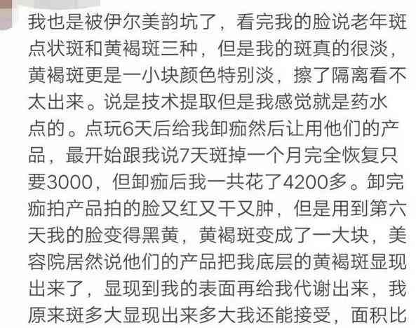小周(化名)就是一位伊爾美韻的受害人,對(duì)于她的遭遇,她如此說道:“我也是被伊爾美韻坑了,他們看完我的臉說是用技術(shù)提取,但是我感覺就是藥水點(diǎn)的,點(diǎn)完6天后讓我用他們的產(chǎn)品,最開始跟我說7天斑掉,一個(gè)月完全恢復(fù),只要3000,但之后我一共花了4200多。并且產(chǎn)品用到第六天臉就變得黑黃,黃褐斑的面積比以前大了一倍,最后停用去了醫(yī)院。”(內(nèi)容有刪改)