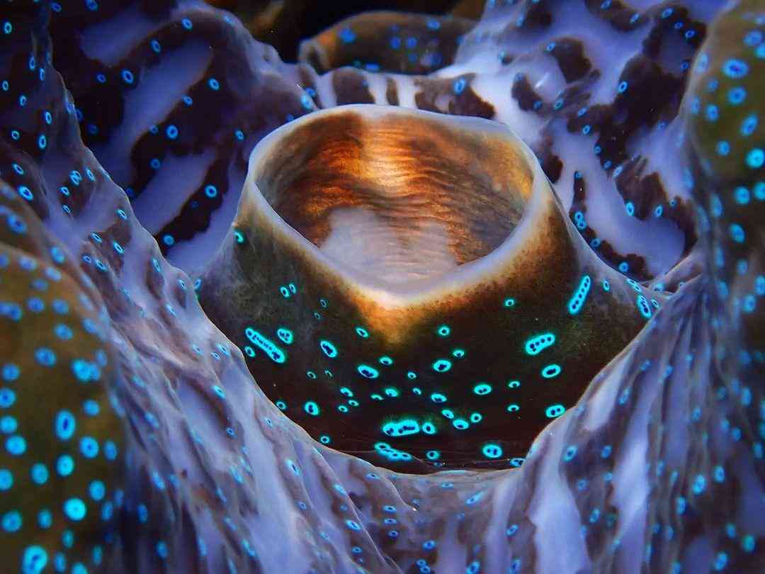 它的地幔(貝殼之間的皮膚褶皺)通常呈金棕色、黃色或綠色,在地幔邊緣附近有許多閃光的藍(lán)色、紫色或綠色斑點(diǎn)。