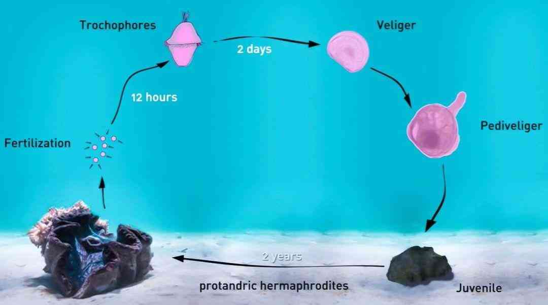 受精卵會在海中漂浮約12小時,直到最終孵化成幼體,隨后開始產(chǎn)生碳酸鈣的殼。很快它會長出像“腳”一樣的前內(nèi)收肌,用來在地上移動,它還可以游泳以尋找合適的棲息地,大約一周大時會開始定居,最初的幾周內(nèi)會經(jīng)常改變位置,一旦確定自己的居所后將終生不再移動。