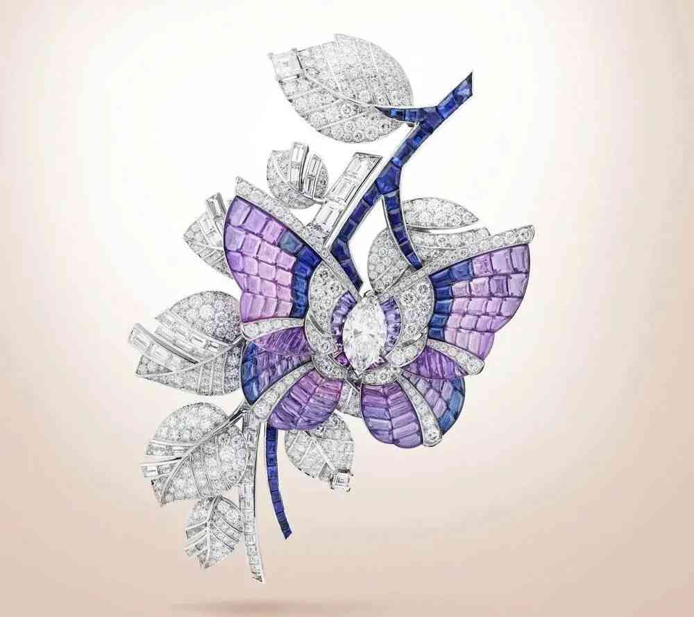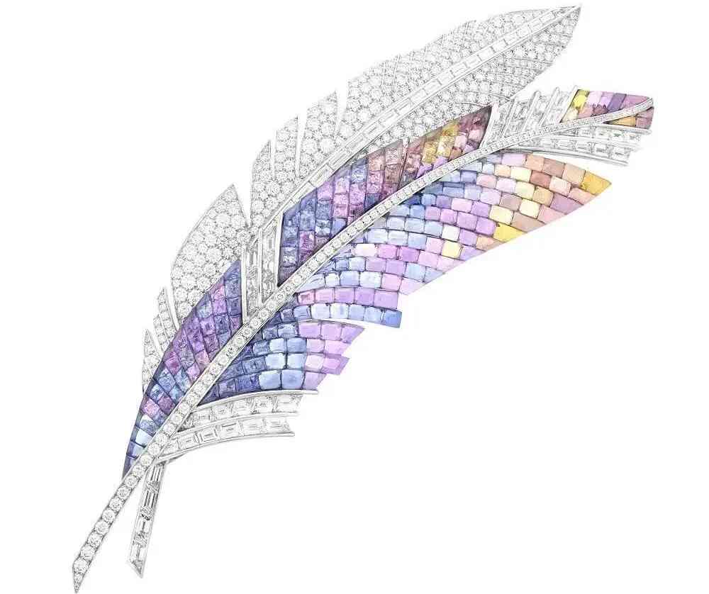 梵克雅寶前幾年做的一款Panache Mystérieux羽毛胸針,采用升級后的彩繪玻璃隱密式鑲嵌法,連最基礎(chǔ)厚重的底座都隱藏起來,看起來如此通透的珠寶真的只有VCA能夠做得到。