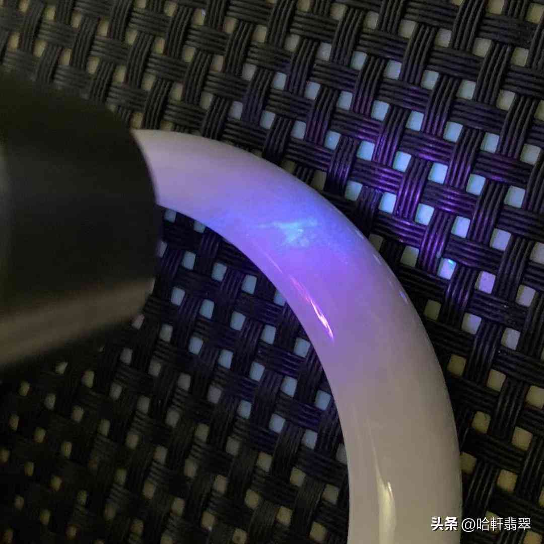 比如上圖這只手鐲在紫光燈的照射下,就隱隱出現(xiàn)了熒光反應(yīng)。但它并不是假貨,而是貨真價(jià)實(shí)的天然翡翠!