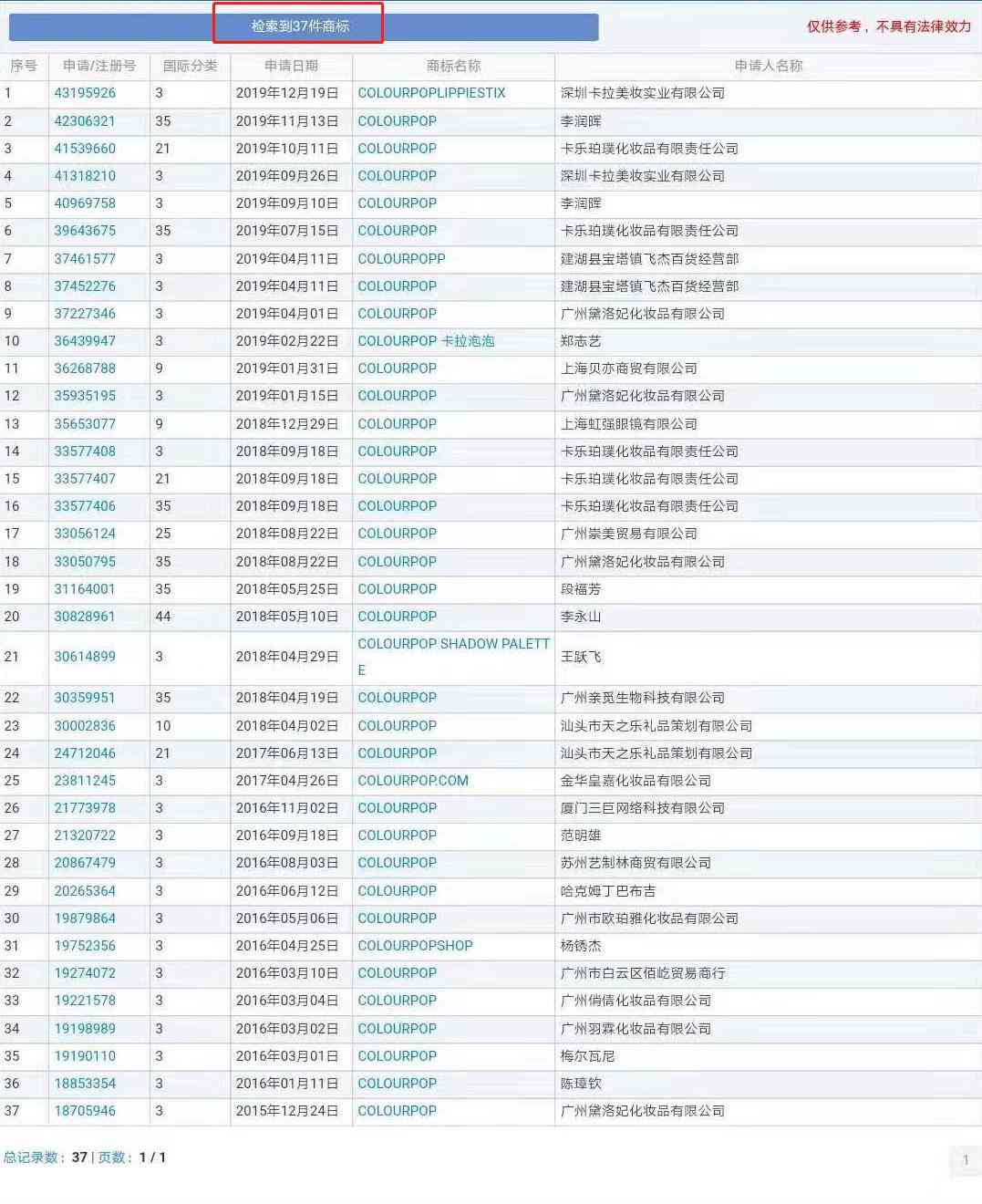 筆者去商標(biāo)網(wǎng)直接搜索“colourpop”商標(biāo),跳出來(lái)了37件商標(biāo)。其中有23件商標(biāo)都是申請(qǐng)應(yīng)用在第3類化妝品上的。