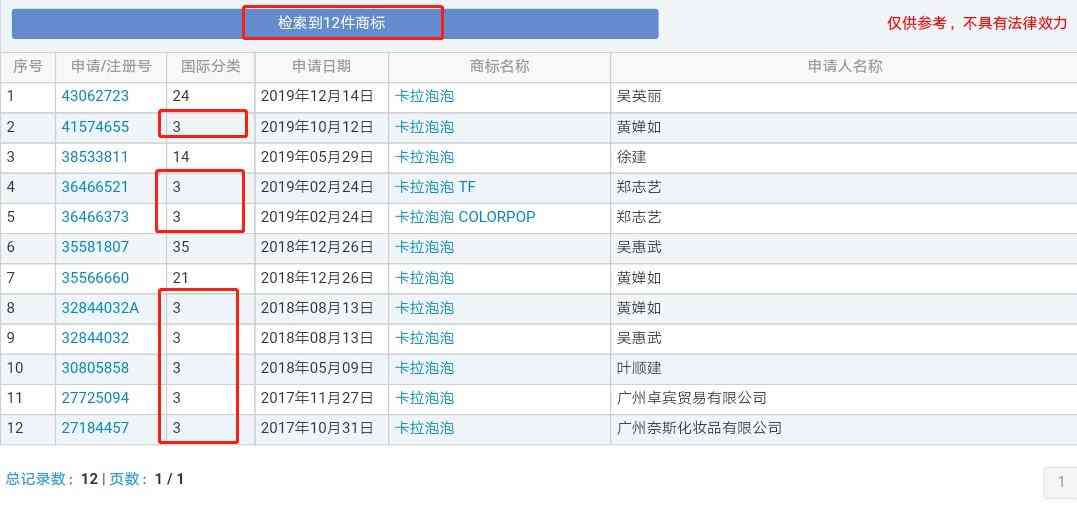 還有人申請(qǐng)“卡樂(lè)泡泡”、“卡拉泡泡”等中文商標(biāo),這兩個(gè)申請(qǐng)商標(biāo)涵蓋了多個(gè)類別,但其國(guó)際分類都含有第3類化妝品。