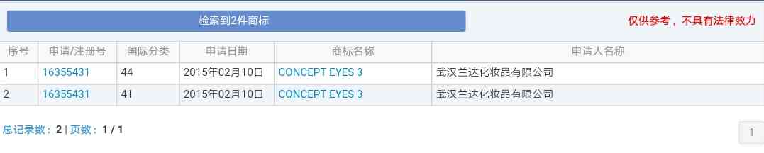 筆者經(jīng)查詢得知,中國(guó)3CE所屬于武漢蘭達(dá)化妝品有限公司,該公司共申請(qǐng)了兩件商標(biāo),商標(biāo)名稱都為“CONCEPT EYES 3”,分別申請(qǐng)?jiān)?4類、41類。