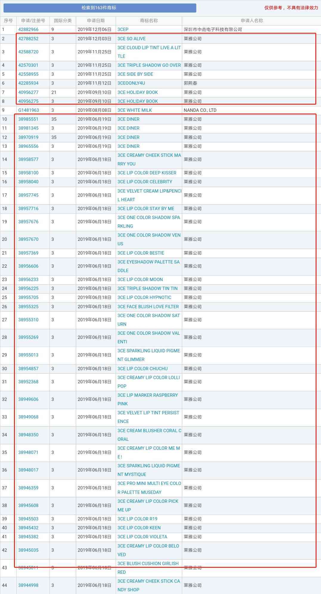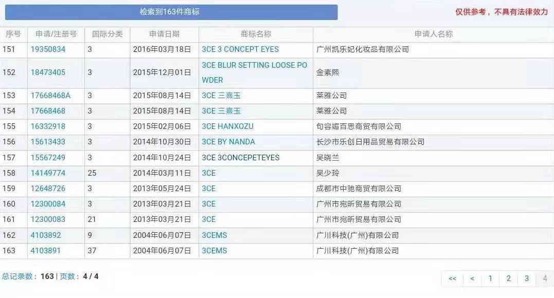 通過(guò)商標(biāo)網(wǎng)查詢,共有163件關(guān)于“3CE”的商標(biāo)。
