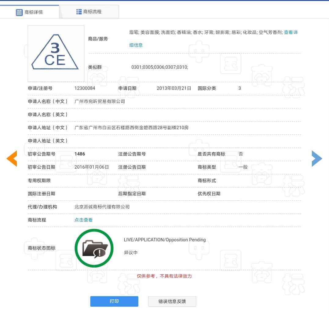 其中,在我國(guó)最早申請(qǐng)第3類化妝品“3CE”商標(biāo)的是一家叫做“廣州宛昕貿(mào)易有限公司”的企業(yè)。該公司申請(qǐng)了多件關(guān)于“3CE”字樣的商標(biāo),其中該公司申請(qǐng)的第12300084號(hào)第3類“3CE”商標(biāo)于2013年3月21日申請(qǐng),但目前該商標(biāo)處于異議狀態(tài)。