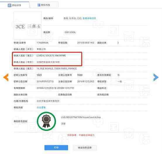 歐萊雅集團(tuán)申請(qǐng)的件關(guān)于“3CE”的商標(biāo)是第3類17668468A號(hào)“3CE 三熹玉”商標(biāo),該商標(biāo)于2015年8月14日申請(qǐng)。
