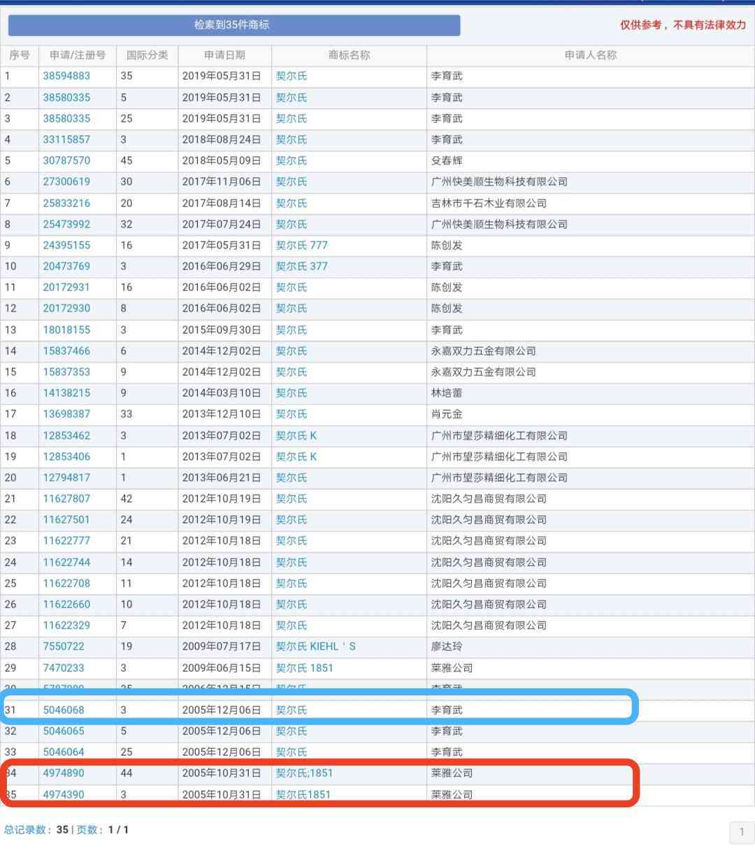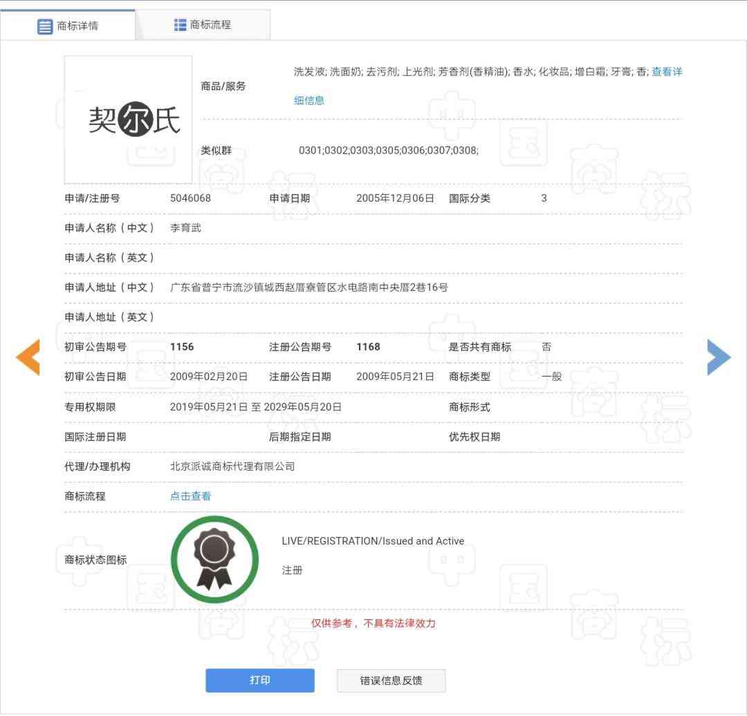 雖然歐萊雅集團(tuán)被駁回了,但是有一個(gè)叫“李育武”的人成功注冊(cè)了第3類“契爾氏”商標(biāo)(即第5046068號(hào)“契爾氏”商標(biāo)),并且這位李先生從2005年12月6日至2019年5月31日,已經(jīng)先后申請(qǐng)了共計(jì)10件“契爾氏”的相關(guān)商標(biāo)。