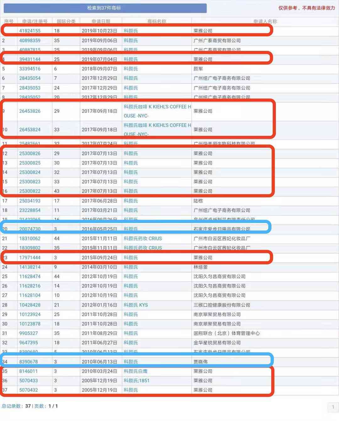但是即使已經(jīng)改名了,科顏氏的商標(biāo)還是沒(méi)能避免被人蹭熱度。經(jīng)商標(biāo)網(wǎng)查詢,總共有37件與“科顏氏”有關(guān)的商標(biāo),其中,科顏氏所屬的歐萊雅集團(tuán)申請(qǐng)了13件商標(biāo),還有兩件第3類的“科顏氏”商標(biāo)分別是個(gè)人和一家公司所申請(qǐng)的?,F(xiàn)如今,這兩件一件被駁回,一件處于異議狀態(tài)。