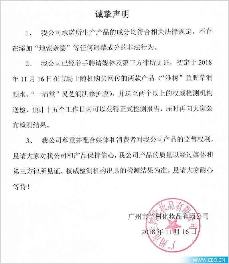 今日9:20,蘭樹方面再發(fā)聲明,表示“我公司表示已著手聘請媒體和第三方律所見證,初定于2018年11月16日在市場上隨機(jī)購買網(wǎng)傳的兩款產(chǎn)品(“淮樹”魚腥草潤顏水、“一清堂”林芝潤肌修護(hù)膜),并將送至兩個以上的權(quán)威檢驗機(jī)構(gòu)送檢,預(yù)計十五個工作日內(nèi)可以獲得正式檢測報告,屆時再向大家公布檢測結(jié)果。”