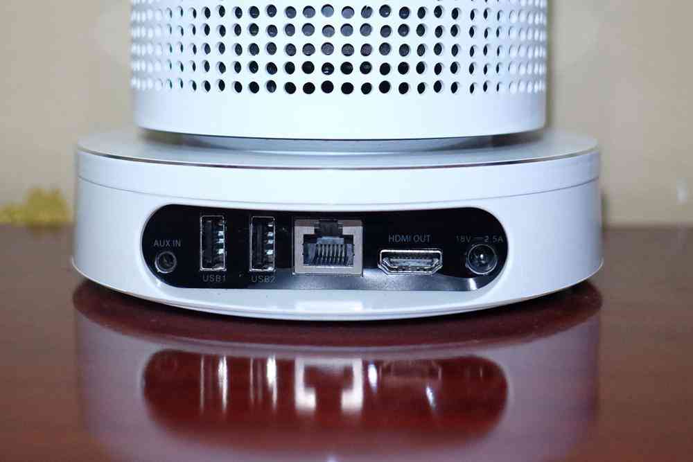在底座的背面是小愛A1的所有接口,從左到右依次序是AUX IN音頻輸入接口、兩個(gè)USB接口、RJ-45網(wǎng)絡(luò)接口、電視HDMI輸出接口和電源插孔。AUX IN音頻輸入接口可以接駁手機(jī)和音頻播放器使用,而USB接口可以輕松讀取U盤或者移動(dòng)硬盤里的主流音視頻媒體文件。