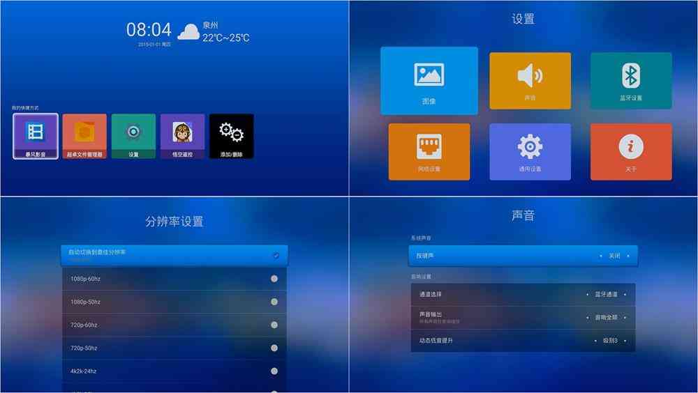在愛浪AOS系統(tǒng)的主界面下,點(diǎn)擊遙控器的向上鍵即可呼出快捷應(yīng)用界面,而且用戶可以根據(jù)自己的需求對(duì)應(yīng)用快捷圖標(biāo)進(jìn)行添加刪除。至于該界面下的時(shí)間與天氣,則是愛浪AOS系統(tǒng)根據(jù)網(wǎng)絡(luò)進(jìn)行自動(dòng)更新。在設(shè)置界面里,共有圖像、聲音、藍(lán)牙、網(wǎng)絡(luò)、通用和關(guān)于六個(gè)板塊,各個(gè)功能選項(xiàng)的設(shè)置也都比較簡單,即使初次接觸的話,也可以快速掌握。
