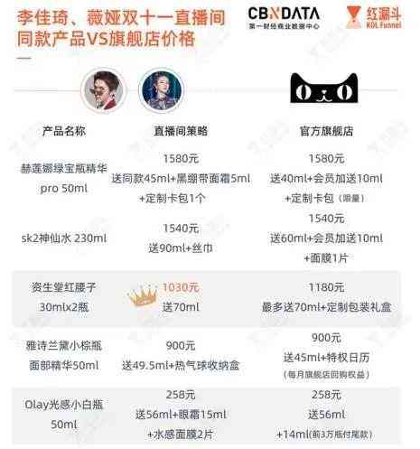 其中,以在李佳琦、薇婭雙十一直播間同時出現(xiàn)的SK-II/230ml神仙水為例,該商品價格在“兩大頂流”直播間并不具有價格優(yōu)勢,與品牌天貓旗艦店一致。同樣,直播間里50ml的雅詩蘭黛小棕瓶面部精華的價格也與品牌天貓旗艦店保持一致。但可以看到的是,為了保持品牌“不掉價”,品牌商家則選擇以諸多贈品的方式去維持品牌價值。
