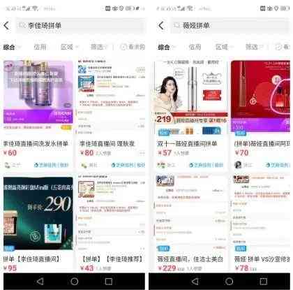 據(jù)了解,天貓雙十一預(yù)售首日,李佳琦直播間美妝產(chǎn)品占到了所有產(chǎn)品的85%,超過100件。而薇婭直播間整體產(chǎn)品數(shù)量稍多于李佳琦,美妝類商品數(shù)量占比55%。正因如此,以“李佳琦拼單”、“薇婭拼單”等關(guān)鍵詞在閑魚平臺上進(jìn)行搜索,可以找到不少涉及美妝、個護(hù)等相關(guān)商品信息。