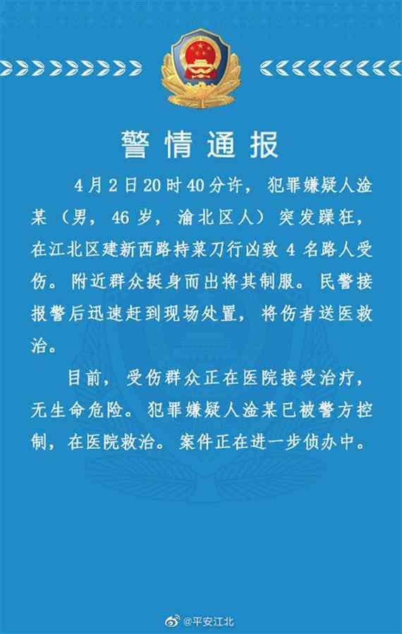 4月2日23時(shí)許,江北區(qū)公安分局發(fā)布警情通報(bào)稱,4月2日20時(shí)40分許,犯罪嫌疑人淦某(男,46歲,渝北區(qū)人)突發(fā)躁狂,在江北區(qū)建新西路持菜刀行兇致4名路人受傷。附近群眾挺身而出將其制服。民警接報(bào)警后迅速趕到現(xiàn)場(chǎng)處置,將傷者送醫(yī)救治。