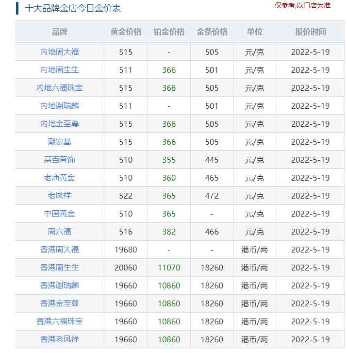周大福今日金價515元/克,六福黃金今日價格515元/克,周生生今日金價511元/克,金至尊最近金價515元/克,謝瑞麟今天金價511元/克,老鳳祥今日黃金價格522元/克,老廟黃金價格510元/克,菜百今日金價510元/克,周大生目前金價515元/克,中國黃金價格元/克,金大福金價510元/克,潮宏基黃金報價515元/克,周六福金價今日價格516元/克。
