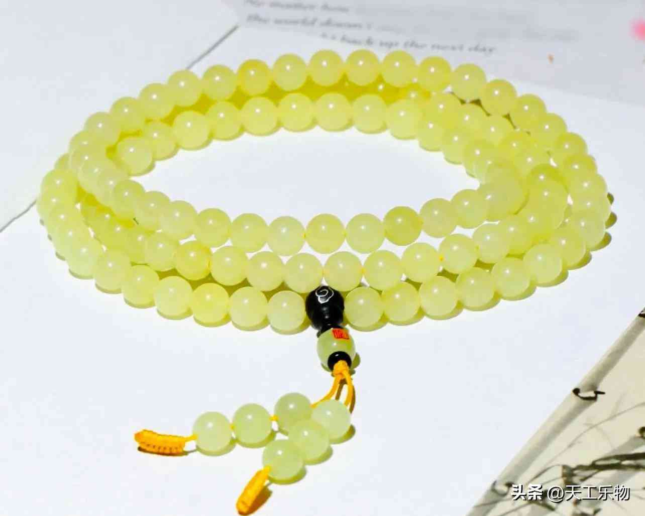 黃口料,尤其是黑山黃口,玉色會有些許偏綠的感覺。色調(diào)明亮飽滿,即使是小料珠串也能不透不水。