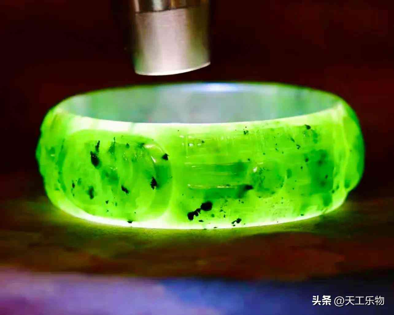 瑪納斯碧玉最明顯的特點,就是玉帶與石紋夾雜。做手鐲常常要借助雕工去除,相比之下黑點倒不算什么大事了。