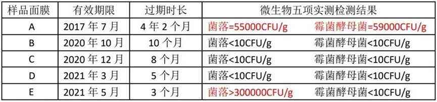 實驗對象選擇了親們最愛屯的護(hù)膚品之一——面膜。由工作人員友情提供過期不同時間的面膜,五款面膜的過期時間依次為:2017年7月,2020年10月,2020年12月,2021年3月和2021年5月。