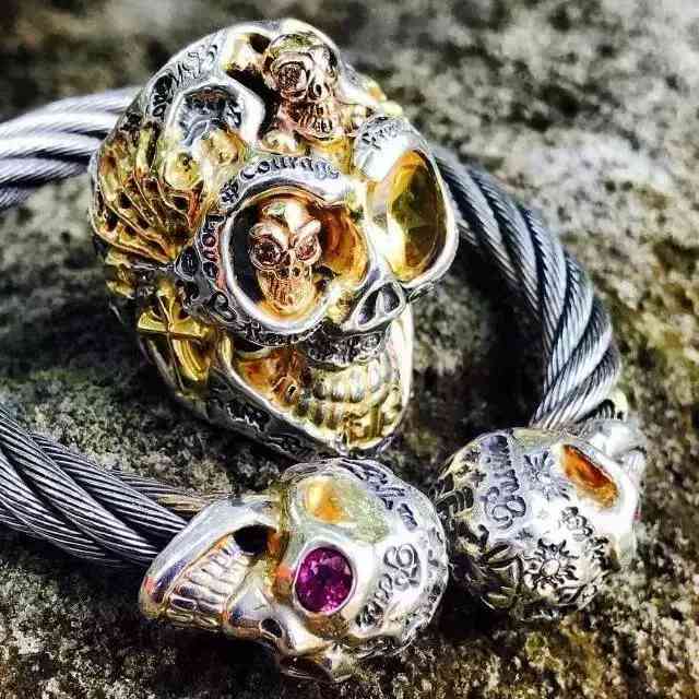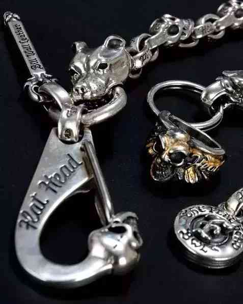 其次也很受歡迎的還有人見人愛的 骷髏頭Skull,銀飾界最痞帥的象征。熱愛飆風而行的重機騎士們與死亡為伍,與速度賽跑,所以希望擁有絕處逢生的志氣,便會在皮以上加裝骷髏頭,事實上有著祈求平安的意味。