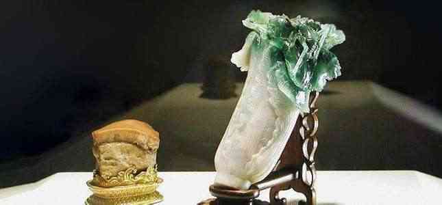 翡翠甜瓜4只,其中兩只為白皮紅子粉瓤,兩只為青皮白子黃瓤,估價為600萬兩銀子,頭頂有一翡翠荷葉,如天然一般,制價為285萬兩銀子,另外有27尊翡翠佛,10個天然翡翠桃子,2棵翡翠白菜,此白菜綠葉白心,菜葉上還雕有2只滿綠的蟈蟈,價值1000萬兩銀子。
